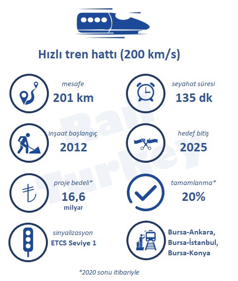 Yapımına 2012 yılında başlanan Bursa hızlı tren hattı, Türkiye’nin başlandıktan sonra yapım işleri en yavaş ilerleyen projesi oldu. 8 yılda projede %20 ilerleme kat edilebildi, sadece 56 km’lik Bursa-Yenişehir etabının altyapısı tamamlanabildi.