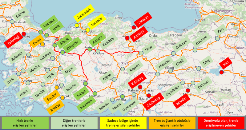Türkiye’de yolcu trenlerinin payı çok gerilerde kalsa da (%1), Türkiye’nin önemli sayıda şehir merkezine trenle ulaşmak mümkün.