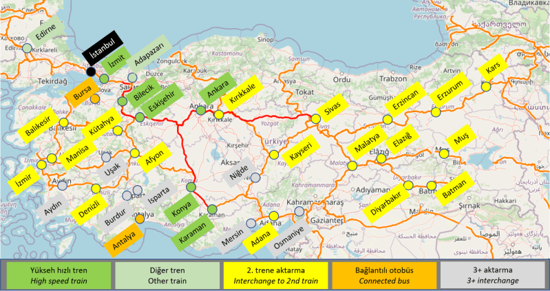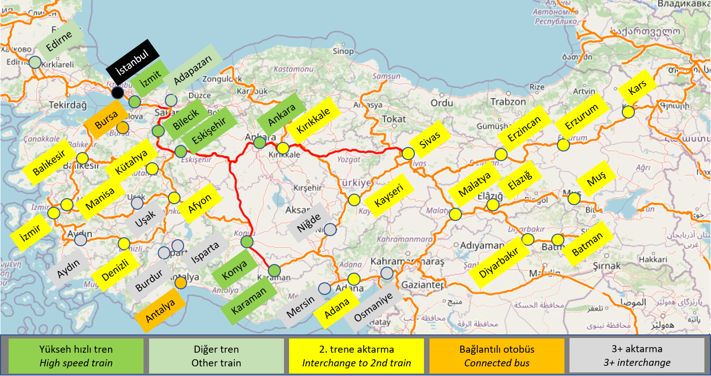 İstanbul’dan bir trenle ulaşılıp başka kentlere erişim için aktarma yapılabilecek 3 ana istasyon bulunmakta: Ankara, Eskişehir ve Konya.