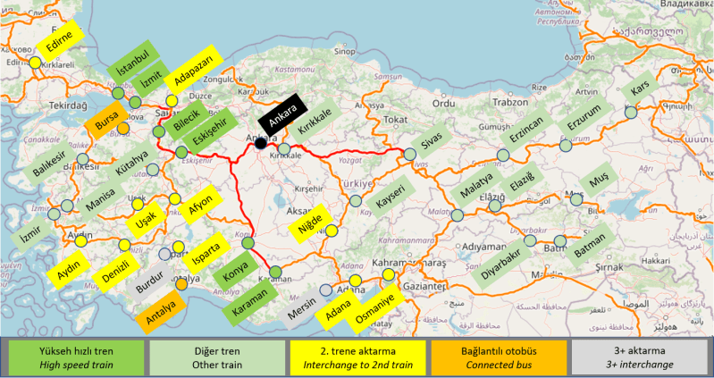 Ankara trenle ulaşım açısından en şanslı şehrimiz. Trenle ulaşılan kent merkezlerinin yarısından fazlasına direk trenle, kalanına da bir aktarmayla ulaşmak mümkün.