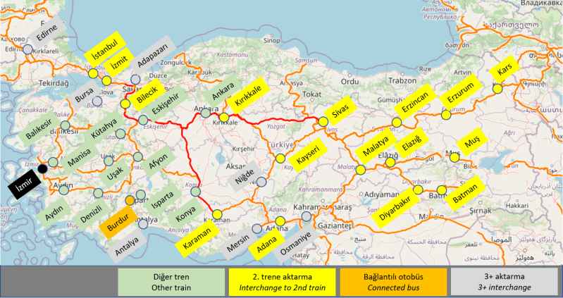 İzmir’den bir trenle ulaşılıp başka kentlere erişim için aktarma yapılabilecek 3 ana istasyon bulunmakta: Ankara, Eskişehir ve Konya.
