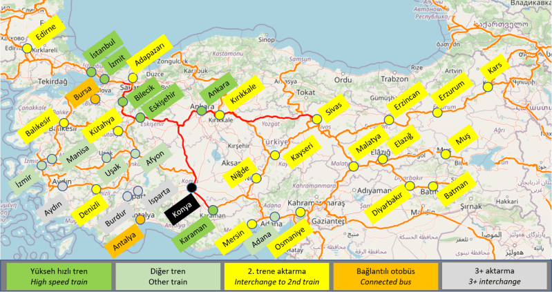 Konya’dan bir trenle ulaşılıp başka kentlere erişim için aktarma yapılabilecek 3 ana istasyon bulunmakta: Ankara, İzmir ve Adana.
