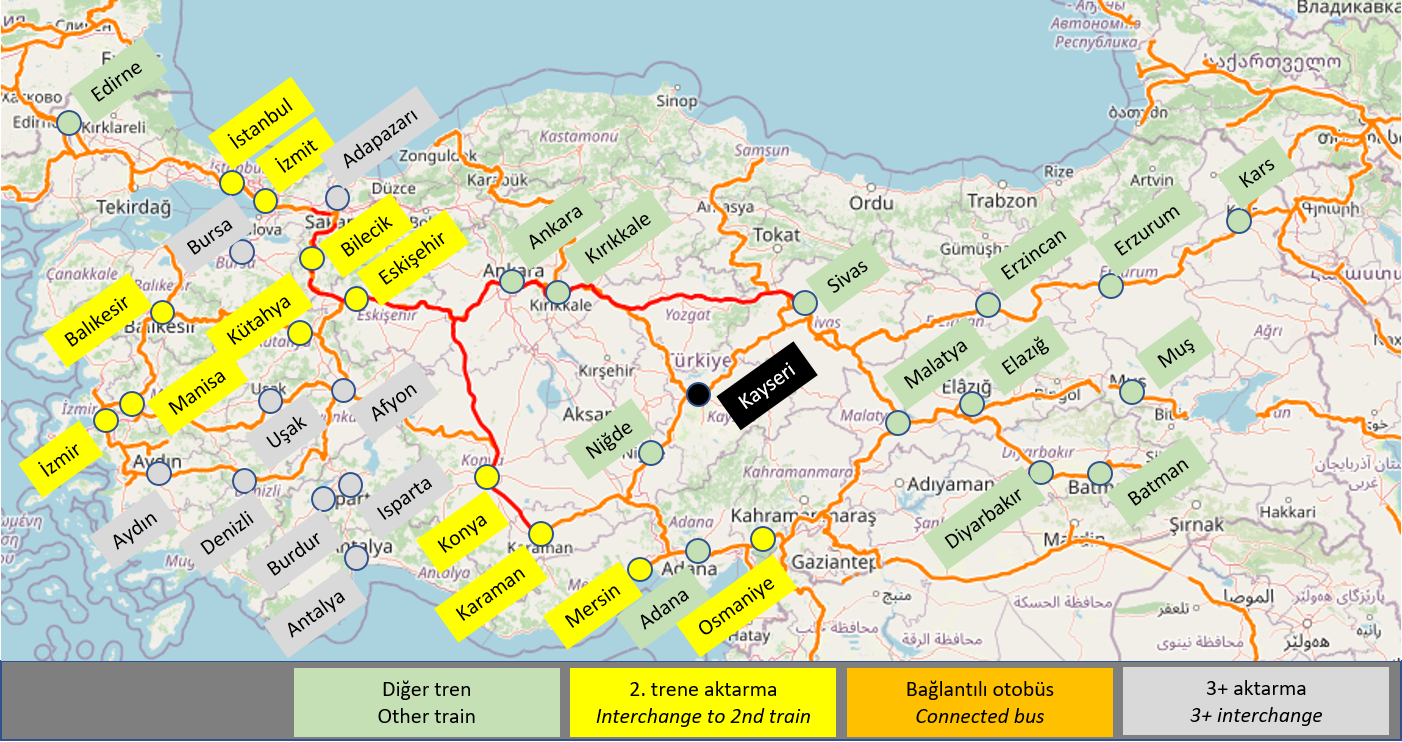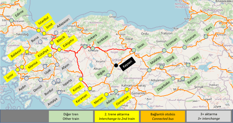 Kayseri, Türkiye’nin doğu yönlü trenleri için bir kavşak noktası. Kayseri çıkışlı sadece bir tren olsa da, Kayseri’den geçen trenlerle çok fazla kente erişim mümkün.