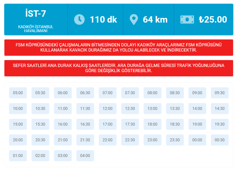 Kadıkoy havalimanı servis saatleri aşağıdaki gibi (diğer duraklar ve havalimanından kalkış saatleri yayınlanmıyor, trafiğe bağlı değişiklik gösterebiliyor):