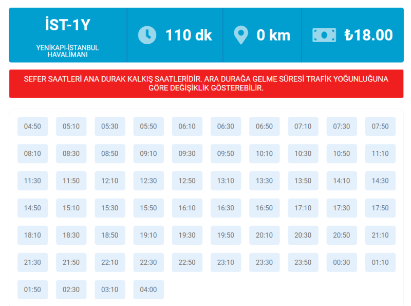 Yenikapı havalimanı servis saatleri aşağıdaki gibi (diğer duraklar ve havalimanından kalkış saatleri yayınlanmıyor, trafiğe bağlı değişiklik gösterebiliyor):