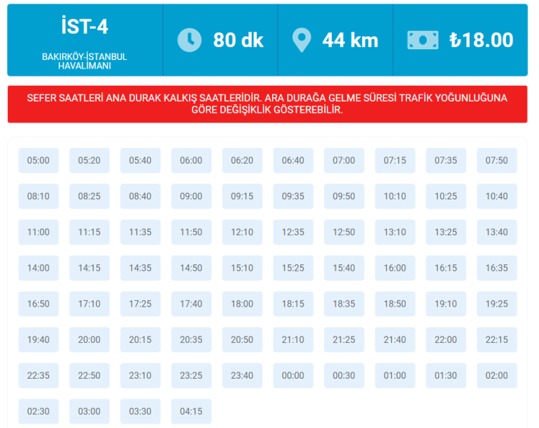 Bakırköy havalimanı servis saatleri aşağıdaki gibi (diğer duraklar ve havalimanından kalkış saatleri yayınlanmıyor, trafiğe bağlı değişiklik gösterebiliyor):