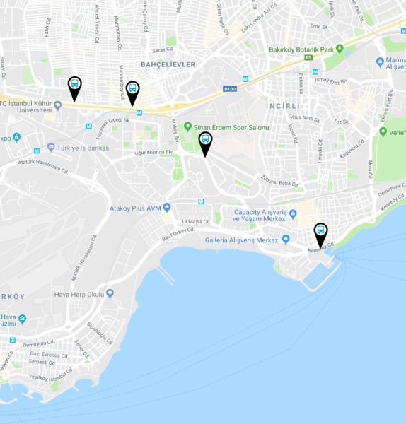 Otobüs Bakırköy sahilden kalkıyor ve aşağıdaki duraklarda duruyor (havalimanı dönüşünde ters sırada):
