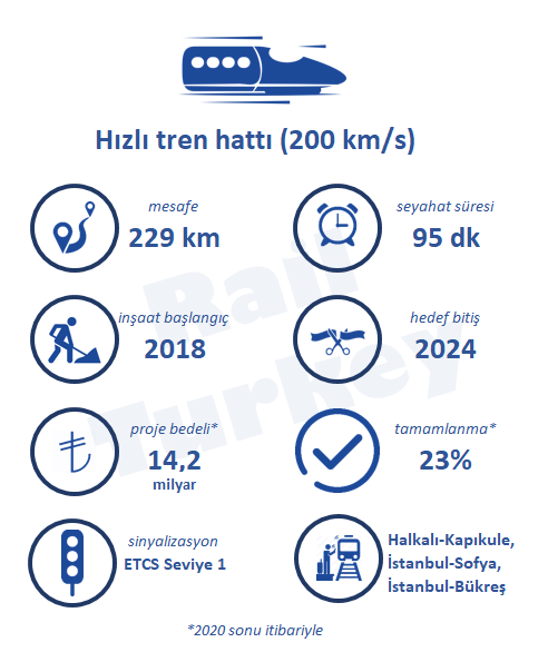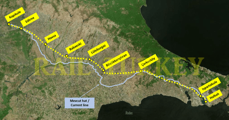 İstanbul’u Kapıkule üzerinden Avrupa’ya bağlayan mevcut tek hatlı demiryoluna alternatif, 229 km uzunluğunda, çift hatlı, elektrikli ve sinyalli, 200 km/s hıza uygun yeni bir demiryolu inşa ediliyor.