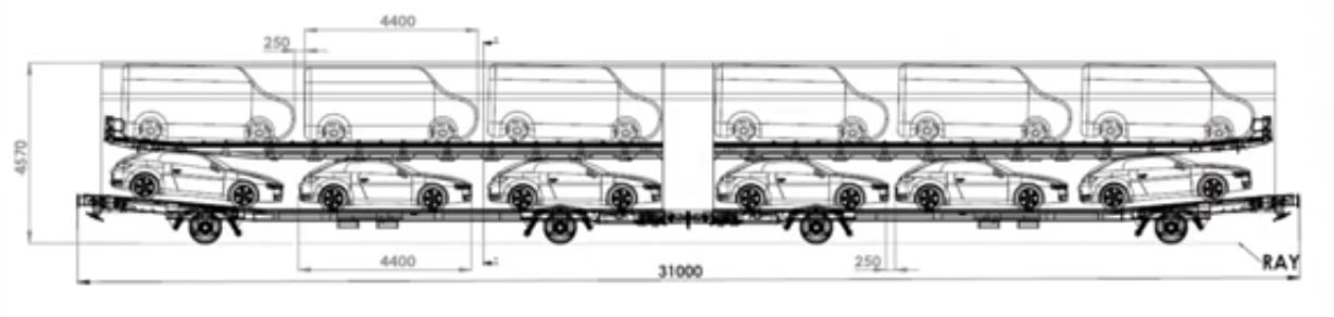 Vagonun yüksekliği 4570 mm. İki katlı yükleme platformuna sahip vagonun üst platformu hareketli. Bu sayede platformun farklı yükseklikteki araçlara göre ayarlanması, Türkiye’de çok kullanılan binek araç ve ticari araçların aynı anda taşınması mümkün.