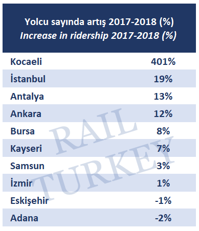 Yolcu artışında 2018’in lideri Kocaeli oldu. Bir önceki yıl yeni açılan ve yılın son 5 ayında hizmet veren Akçaray’ın yolcu sayısının katlanması bekleniyordu. Ancak 5 kat artış ile sıradışı bir büyüme gösterdi.