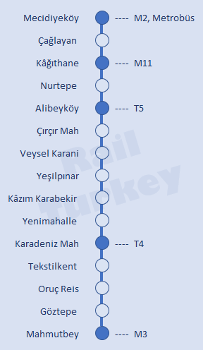 18 km uzunluğundaki hatta seyahat süresi Mecidiyeköy-Mahmutbey arası 26 dakika olacak. Kabataş etabı açıldığında toplam uzunluğu 24.5 km’ye ulaşan hatta Kabataş’tan Mahmutbey’e 33 dakikada seyahat edilebilecek.