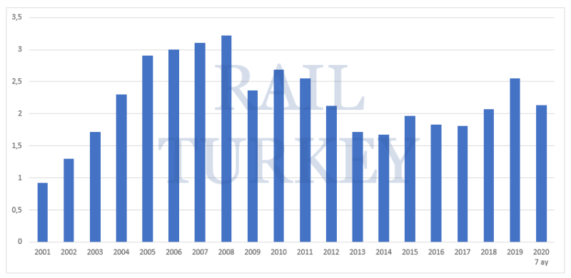 2020’nin ilk 7 ayında, bir önceki senenin aynı dönemine göre %36 artışla 2,13 milyon ton uluslararası yükün taşındığı demiryollarında, sene sonunda 3,5 milyon tona yaklaşılması ve tüm zamanların rekorunun kırılması bekleniyor.