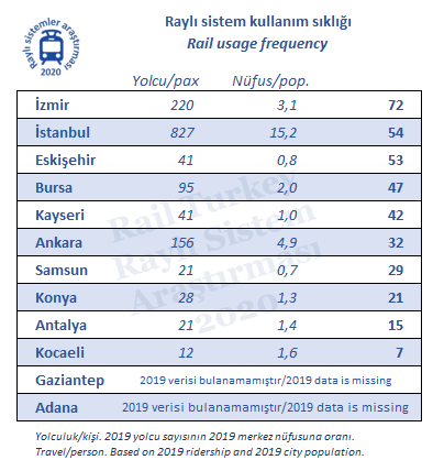 Şehir nüfusunun raylı sistemi kullanma sıklığına baktığımızda, sıralama değişiyor. İzban ile şehir merkezini banliyölere bağlayan İzmir’de geçen sene 222 milyon yolculuk yapıldı. Bu 3 milyonluk İzmir’de her kişinin ortalama 72 kez raylı sistemlerle yolculuk ettiği anlamına geliyor. İstanbul 54 seyahatle ikinci sırada. Ödüllü tramvay sistemine sahip Eskişehir, 53 seyahat ile daha büyük şehirlerin arasından sıyrılarak üçüncü sırada yer alıyor.