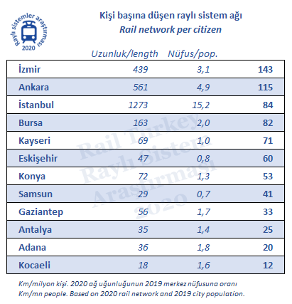 Nüfusuna oranla en geniş raylı sistem ağına sahip şehrimiz İzmir. İzmir’de 1 milyon kişiye 143 km raylı sistem hattı düşüyor. Ankara 115 km ile 2. sırada. Raylı sistem ağı uzunluğu ve taşınan yolcu sayısında lider İstanbul, nüfusa oranlandığında 3. sıraya düşüyor. Kayseri, nüfusa oranlanınca listede yukarı tırmanırken, nüfusu son yıllarda hızla artan Antalya listede alt sıralara indi.