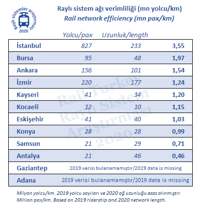 Raylı sistem yatırımlarının ne kadar doğru yapıldığını gösteren önemli bir parametre, taşınan yolcu sayısının hat uzunluğuna bölümü. Bu oran, raylı sistem yatırımlarının öncelikli hatlara yapılıp yapılmadığını, diğer ulaşım araçlarıyla entegrasyonun ne derece yapıldığına dair ipucu veriyor.