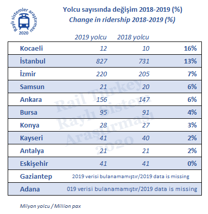 İzmir’deki ise yeni açılan tramvay hatlarıyla büyüdü. 2019’a grevle başlayan İzban ve İzmir Metro’nun yolcu sayısı fazla değişmedi, ancak tramvaylar raylı sisteme yeni yolcular kattı.