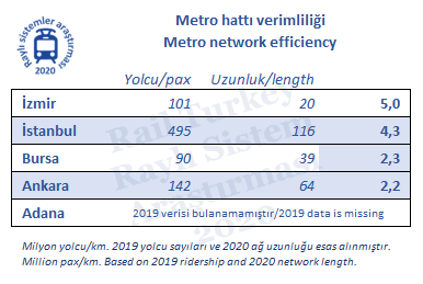 Halen 5 ilimizde metro hattı bulunuyor. 20 km uzunluğundaki hatta taşınan 100 milyon yolcu, İzmir’i listenin başına taşıyor. Tramvaylar ve banliyö ile de entegre olan metro şimdilik tek hat.