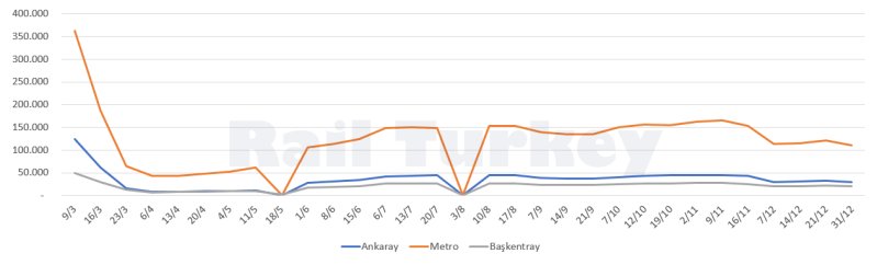 Ankara’da tüm yıl istatistikleri henüz yayınlanmasa da, yıl içinde seçme günlere ait toplu ulaşım sayıları İstanbul’la paralellik gösteriyor:
