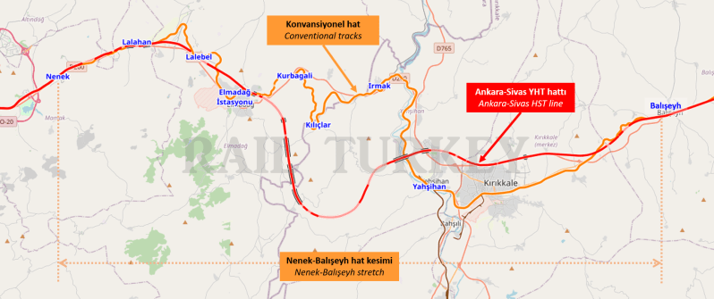 Projede Elmadağ-Kırıkkale arasındaki 29 km’lik bölümde altyapı çalışmaları halen devam ediyor. Çok sayıda tünel ve viyadüğün olduğu bu bölümün Ekim 2020 itibariyle durumunu gösteren drone çekimi, bu bölümün açılışının bu yıl olmayacağına işaret ediyor. Bu nedenle, İstanbul-Ankara hızlı trenindeki uygulamaya benzer şekilde, bu bölümde diğer yolcu trenleri ve yük trenlerinin çalıştığı konvansiyonel hat kullanılacak. Hızlı tren, Ankara’nın Nenek istasyonunda konvansiyonel hatta geçecek ve 94 km sonra Kırıkkale’nin Balışeyh istasyonunda tekrar hızlı tren hattına dönecek.