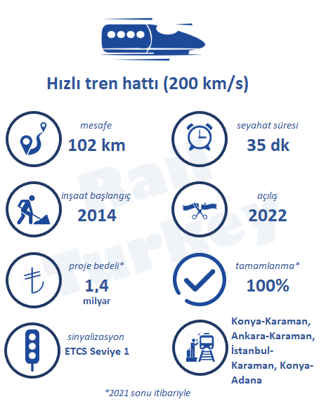 Ulaştırma Bakanı Adil Karaismailoğlu, Konya-Karaman hızlı tren hattının 8 Ocak Cumartesi günü hizmete alınacağını açıkladı. Konya’yı Karaman’a bağlayan mevcut konvansiyonel hat, 200 km/s hıza uygun şekilde, hemzemin geçitler kaldırılarak, çift hatlı, elektrikli ve sinyalli olarak yeniden inşa edildi.