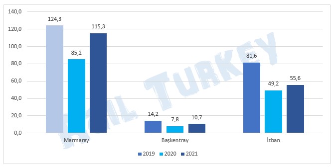 İstanbul ve Ankara’daki TCDD Taşımacılık, İzmir’deki ise İzmir Büyükşehir Belediyesi ve TCDD Taşımacılık iştiraki olan İzban tarafından işletilen banliyö trenleri de pandemi sürecinden etkilendiler. Üç büyük şehirin trenleri arasında en az etkilenen ve en hızlı toparlanan ise Marmaray oldu. İstanbul’u bir uçtan bir uca bağlayan ve çok sayıda metro ve toplu ulaşım sistemine entegre Marmaray, pandemi önlemlerinin devam ettiği 2021’de bile eski günlerine yaklaştı.
