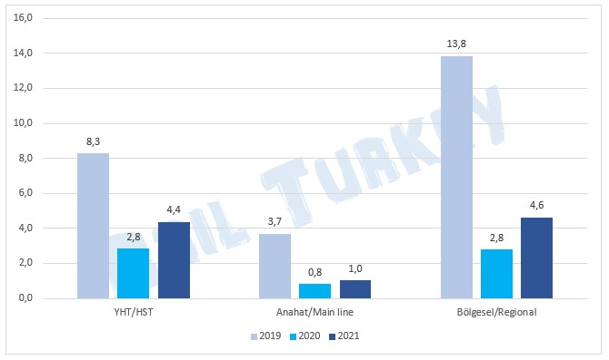 Demiryollarında pandemiden en çok etkilenen ise şüphesiz yolcu trenleri oldu. Pandeminin ilk günlerinde tüm seferlerin durdurulduğu yolcu trenlerinde tüm trenlerin seferlerine başlaması bir yıldan uzun sürdü. Eski yolcu sayılarına ulaşılması ise zaman alacak gibi gözüküyor. Salgından önceki son yıl olan 2019 ile sonraki iki yıldaki tren yolcu sayıları şöyle: