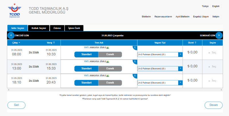 Uzun bir bekleyişin dün açılışı yapılan ve bugün düzenli seferlerine başlayan Ankara-Sivas hızlı treninde 31 Mayıs’a kadar taşımaların ücretsiz olacağı açıklandı. 27 Nisan öğlen itibariyle her iki yönde 31 Mayıs’a kadar olan seferlerin tüm biletleri satıldı. TCDD Taşımacılık’ın bilet sisteminde, bir kaç engelli koltuğu dışında tüm yerlerin satıldığı gözükmekte.