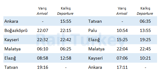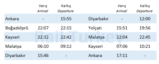 Diyarbakır-Ankara güzergahında ise tren her Pazar Diyarbakır’dan hareket edecek, Yolçatı’da 4 saat, Kayseri’de ise 3 saat duruş yapacak.