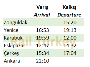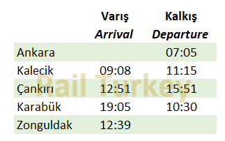 Ankara’dan 12 Nisan, 17, 24 ve 31 Mayıs Cuma günleri kalkacak Ankara-Zonguldak yönlü Turistik Karaelmas Ekspresi, Kalecik’te 2, Çankırı’da 3 saatlik duruşlar yapacak. Karabük’te otelde geceleyecek yolcular, Cumartesi öğlen saatlerinde Zonguldak’ta olacak.