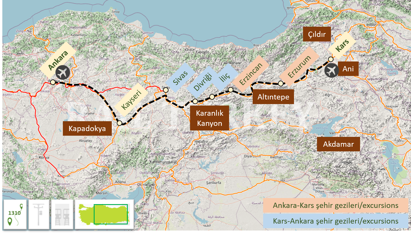 - Bu trende sadece yataklı vagonlar bulunuyor. Tren yol üzerinde Ankara-Kars yönünde İliç ve Erzurum, Kars-Ankara yönünde Erzincan, Divriği ve Sivas’ta 3’er saatlik duruşlar yapıyor. Tren saatlerine uygun olacak şekilde şehir ve çevresineki tarihi ve turistik yerleri turlarla gezmek mümkün. Turlara ilişkin detaylı bilgiye, trende bulunan tur görevlileri aracılığıyla ulaşabilirsiniz.
